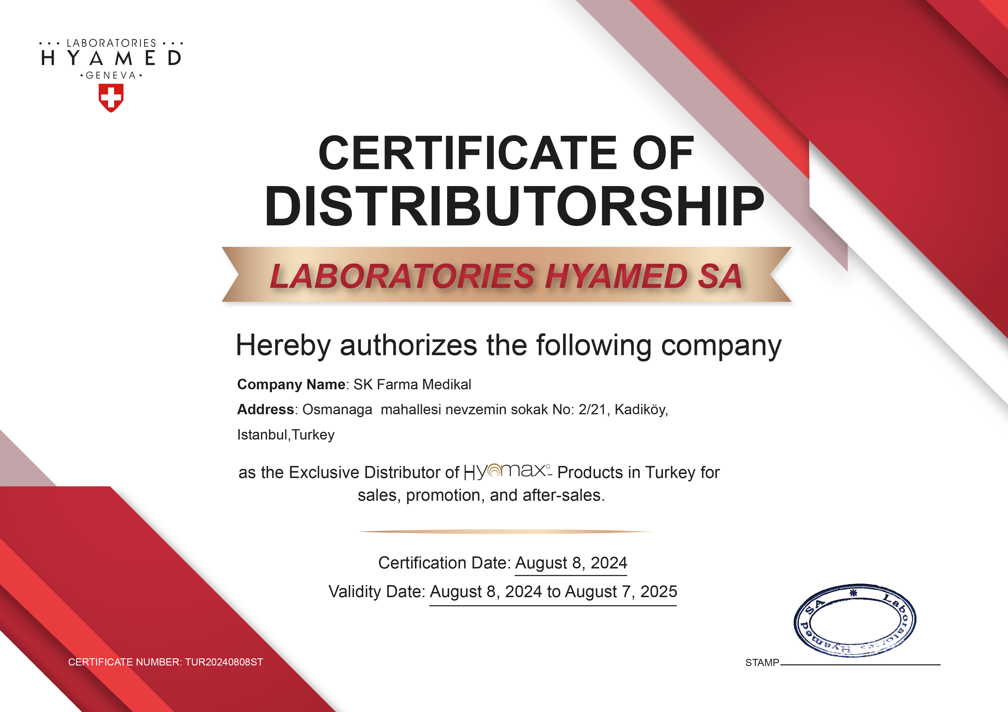 CERTIFICATE OF DISTRIBUTORSHIP LABORATORIES HYAMED SA